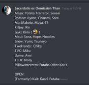 The previous list of narrators as it grew. For the up-to-date list, check Narrator List.A screenshot of the watchers. On the 15th of January, a huge amount of players got together to watch the playthrough of the newly released 0.12.0p1 public release. On the fly, a total of approximately 40 players of the Discord joined to have various characters narrated through the scenes. Throughout the event, it was a community effort to make this both hilarious and incredibly cringy. Never the less, even Selebus joined along for a while and got asked a few questions.The previous banner as made by "Maui Goomba"
