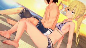 Ayane drags Sensei into a limo and, to his surprise, Sana is with her, though she’s too occupied with her new game to pay attention to them. To make up for his kidnapping, Ayane offers him the opportunity to be the first to see her and Sana’s new swimsuits, which he is eagerly accepts once he hears that both of them have bikinis now. Once they reach the beach, the girls get changed and Sensei compliments both once he got a good look at them. An embarrassed Sana seeks a quiet, shadowy place to continue playing while Ayane leads Sensei near the shore to get some sunlight.